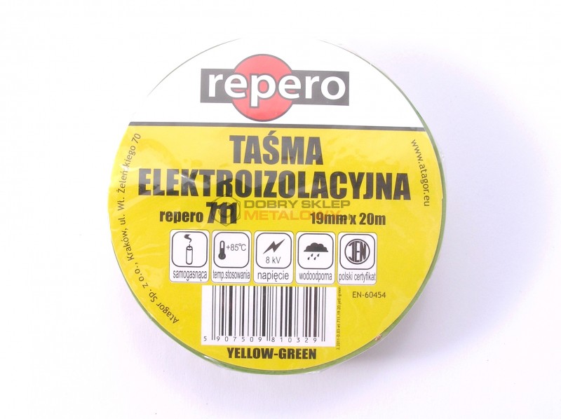 TAŚMA IZOLACYJNA PCV 19MMX20MB ŻÓŁTO-ZIELONA 600V -10'C +85'C REPERO 711E ATAGOR